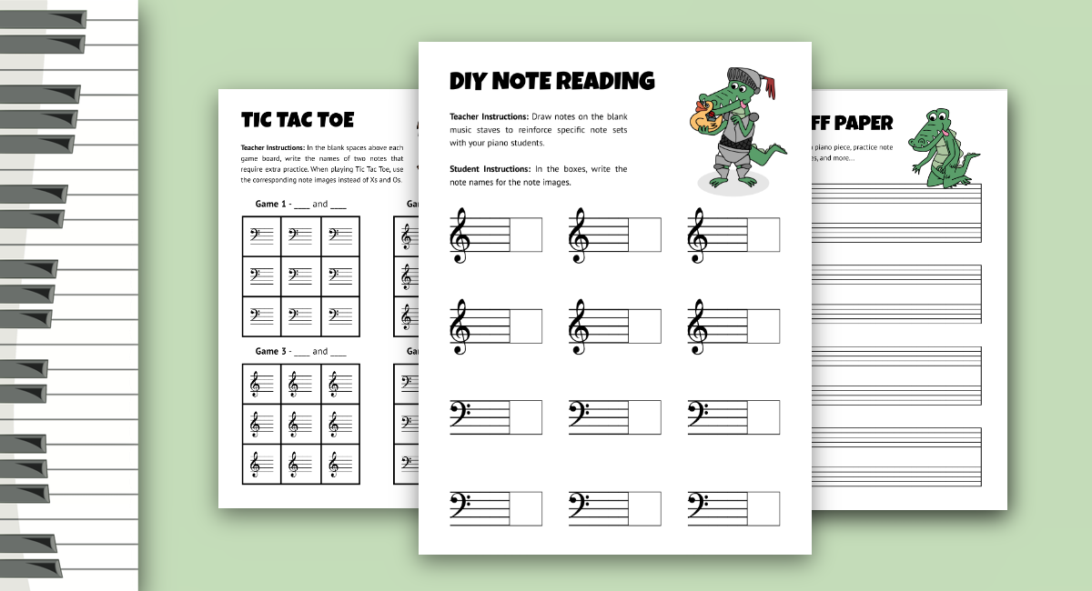 - Tic Tac Toe-style game boards that reinforce note reading while bringing a little laughter into the lesson