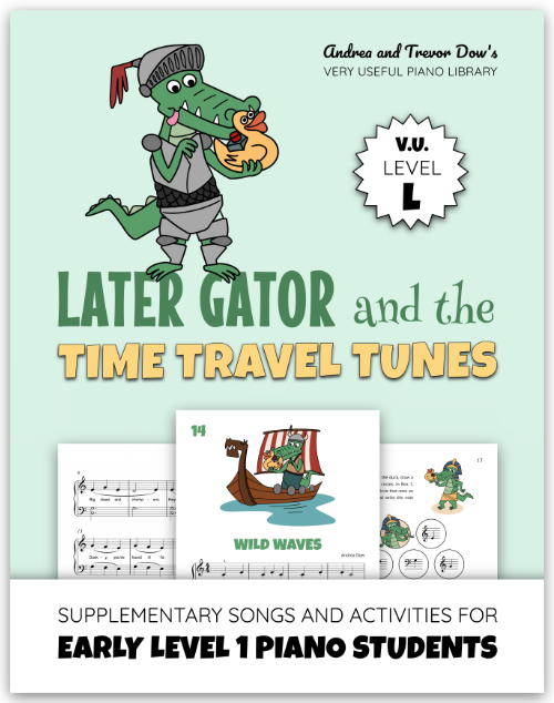 Later Gator and the Time Travel Tunes is an Early Level 1 book (V.U. Level L) filled with a hilarious character, wacky twists, and seriously solid pedagogical structure. You’ll reinforce articulation, the C 5-finger scales, hands-together coordination, and introductory LH accompaniments—all while your students embark on an unforgettable musical journey.