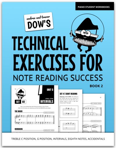 If your level 1 piano students have our newest book, Andrea and Trevor Dow’s Technical Exercises for Note Reading Success, Book 2, then they will always have something effective to practice!