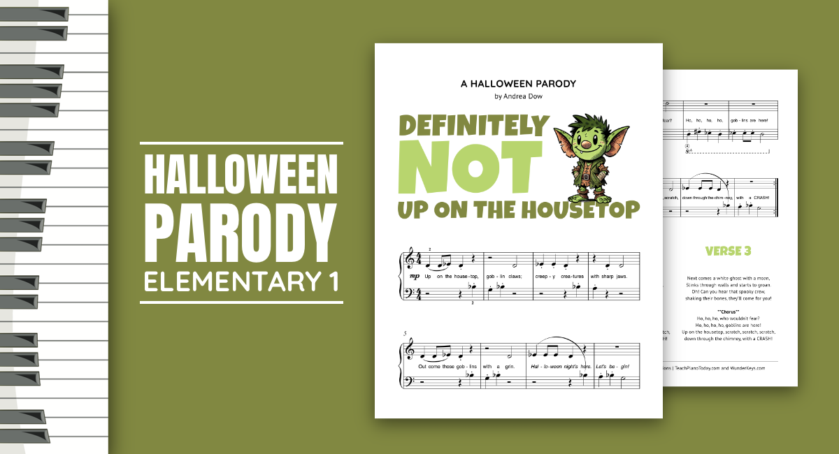 This year, we’re back with another Halloween treat, but this time it’s designed for your younger students. Today’s giveaway is a Level 1B piano solo with a goofy twist on a holiday classic—a playful Halloween parody of Up On the Housetop!