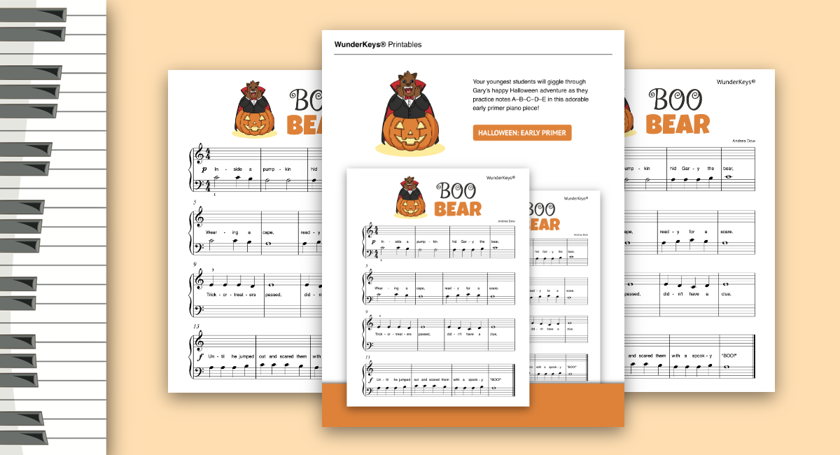In BOO Bear, Gary the bear, from our primer piano book series, hides inside a pumpkin wearing a cape, waiting for the perfect moment to jump out and shout “BOO!” at unsuspecting trick-or-treaters. Your students will giggle through every measure as they practice notes A–B–C–D–E and bring Gary’s playful Halloween adventure to life.