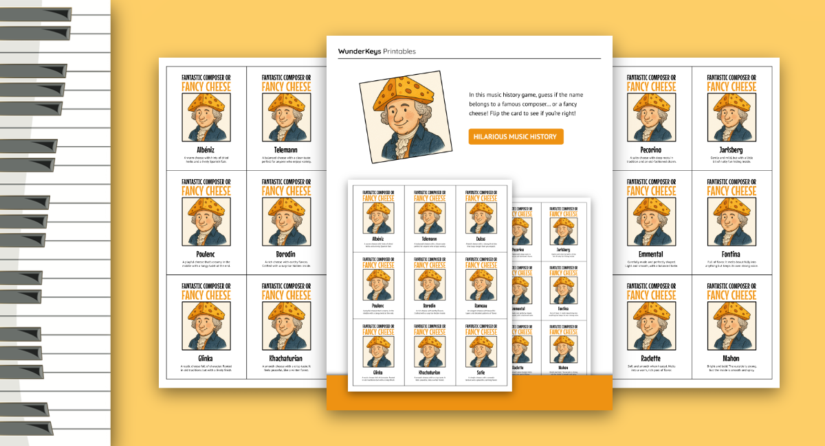 Fantastic Composer or Fancy Cheese is music history dressed up as total silliness. As your students guess, flip, and giggle, they’ll get familiar with the names of famous composers they’ll eventually meet in their sheet music—and pick up a few cheese names along the way. (Because obviously that’s a life skill.)