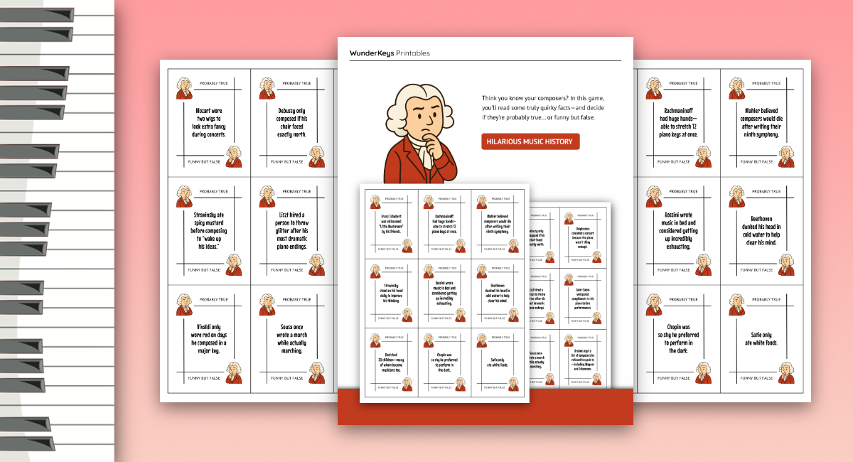 Funny But False? is a print-and-play piano history game for kids that turns composer trivia into something memorable, fun, and full of personality.