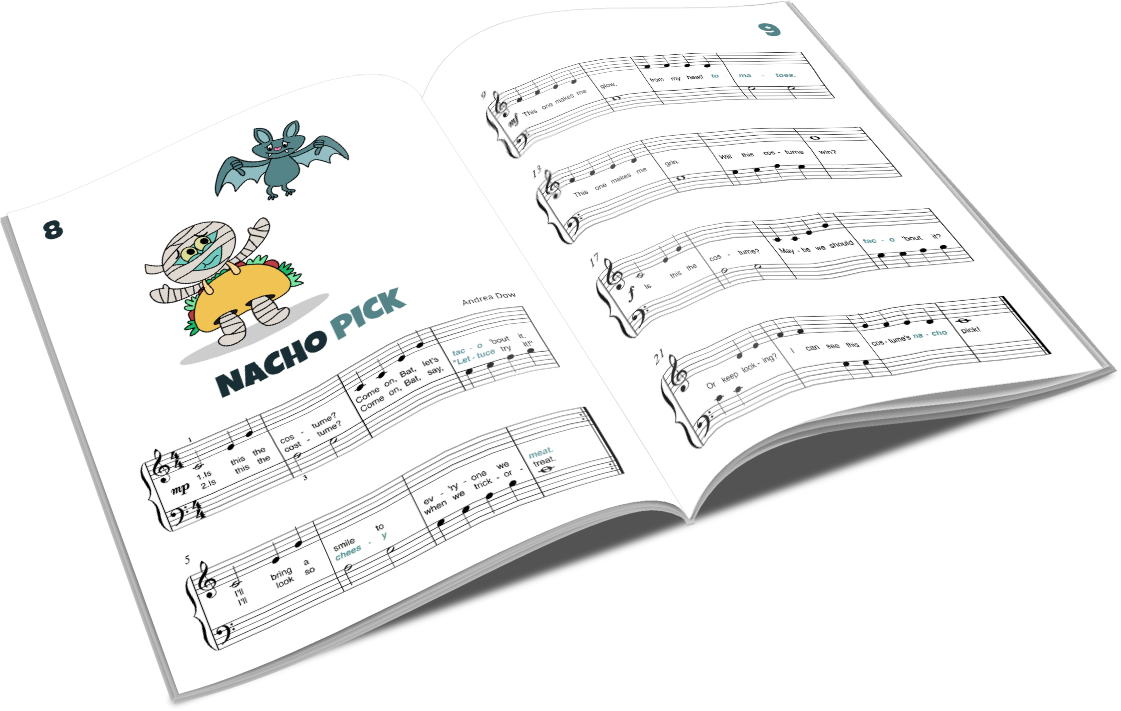 Mummy Rocks The Costume Contest is leveled for mid-primer piano students. Composed in middle C position, this book will help children gain confidence playing music in 3/4 and 4/4 time with stepping and skipping notes.