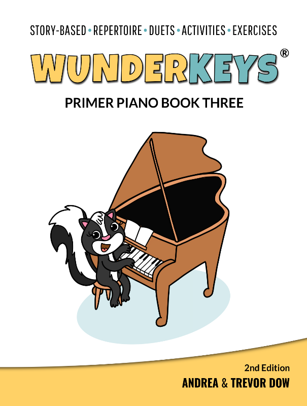 In WunderKeys Primer Piano Book Three, students will improve efficiency in cross-staff note reading, build hand strength and coordination, complete activities designed to improve bilateral abilities, read hands-together notes on the grand staff, explore hands-together stepping and skipping patterns, read rhythmic notation, strengthen aural awareness, and continue acquiring confidence playing out of position.