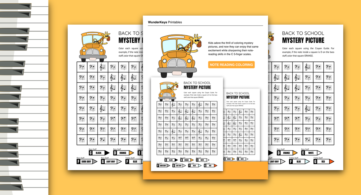 In our “Back To School Note Reading Mystery Picture” activity, each square in a grid contains a note from the C 5-finger scale. A coloring guide shows which crayon matches each note. As kids identify and color each square, they gradually reveal a delightful back-to-school-themed image.