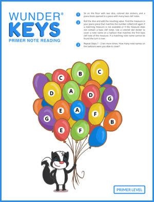 Bass Clef Balloons – Book 2 – Unit 9+ Click the image below to download Bass Clef Balloons. Using dice and colored dots or stickers, this game uses your student’s current piano piece in a fun introduction to score study. Level: WunderKeys Primer Book 2, Module 7 (and beyond).